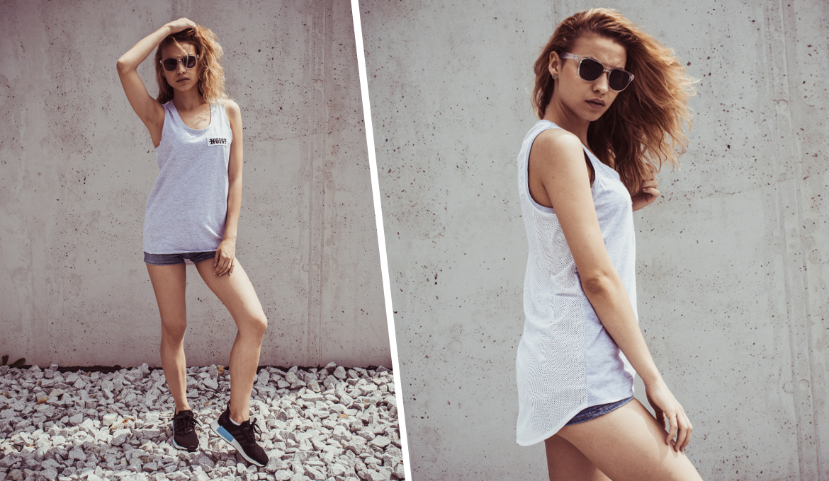 Modelka ma na sobie top z najnowszej kolekcji polskiej marki Jungmob. Ciekawym rozwiązaniem jest tył wykonany z przewiewnej siateczki w jasnym kolorze. Siateczka nie tylko nadaje koszulce ciekawego wyglądu ale i gwarantuje chłód nawet w najcieplejsze dni lata! Z przodu koszulka ozdobiona została haftowaną aplikacją.