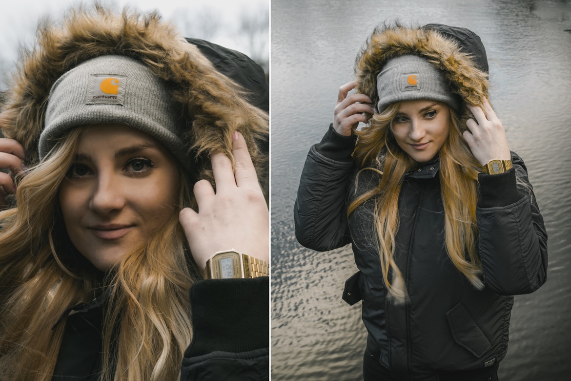 Głowę Natalii osłania klasyk od marki Carhartt, czyli czapka Watch Hat w szarym kolorze. Kurtka to, również produkt marki Carhartt - Marshall