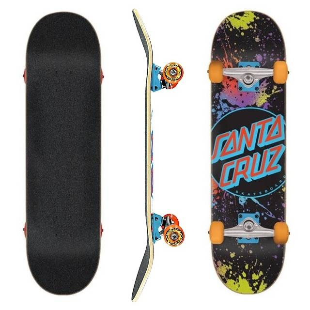 Wysokiej jakości kompletna deskorolka z dużym logotypem Santa Cruz Skateboards i motywem plam z farby
